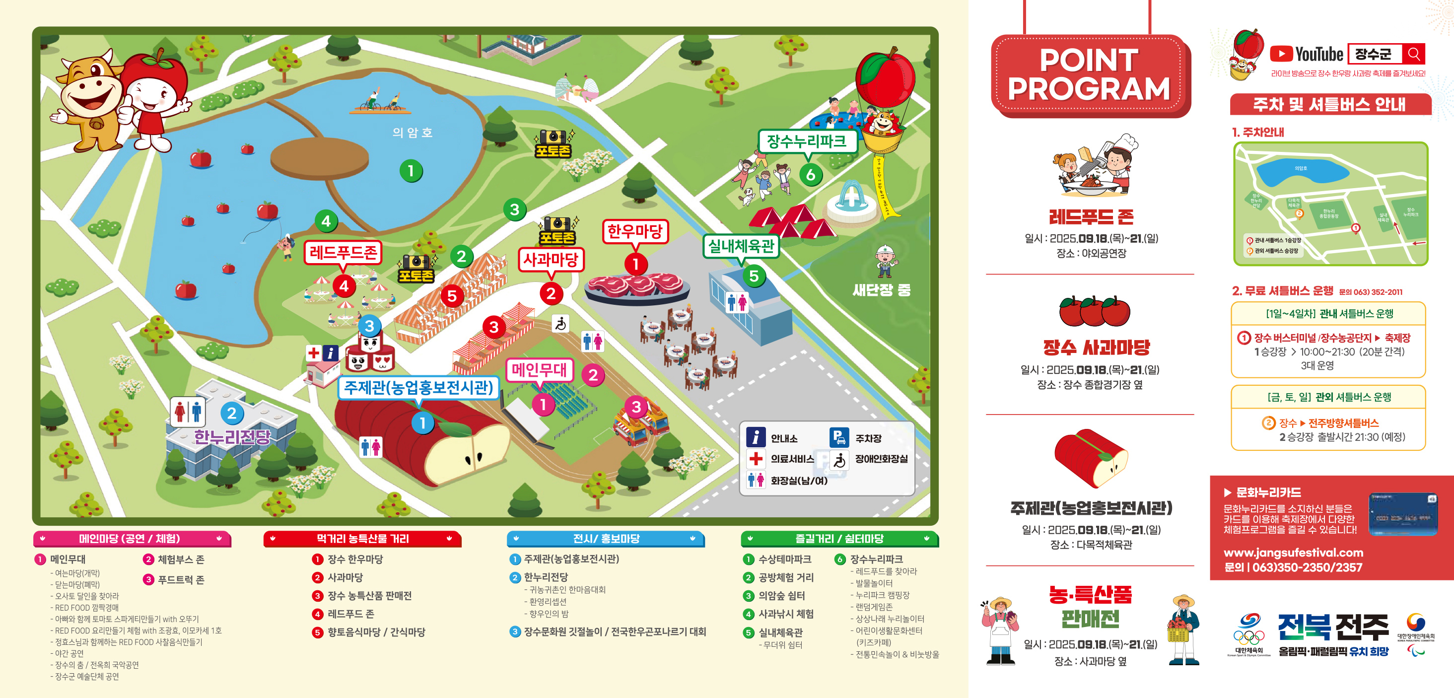 - 사과마당 & 레드푸드 존: 사과, 오미자, 토마토 등 특산물 체험 & 판매