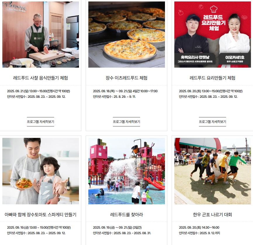 - 요리 체험: 전문 셰프와 함께하는 한우·사과·토마토 요리, 정효스님과 함께하는 사찰음식 체험
