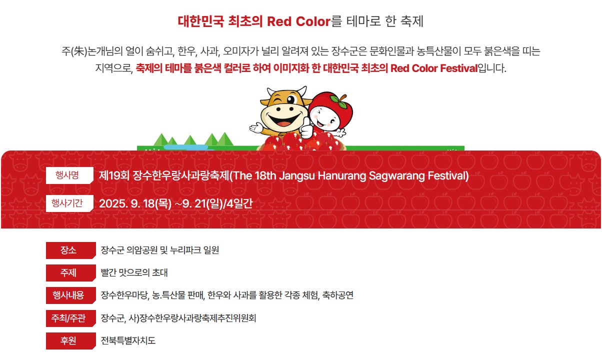 - 주최/주관: 장수군, (사)장수한우랑사과랑축제추진위원회