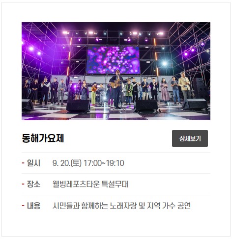 - 동해가요제(9.20): 지역 가수 및 일반 시민이 참가하는 공개 무대