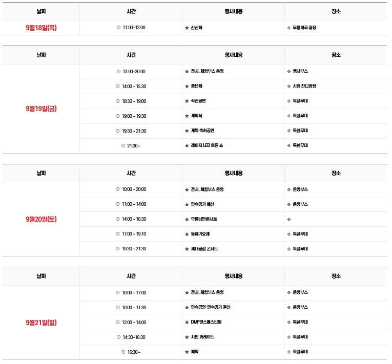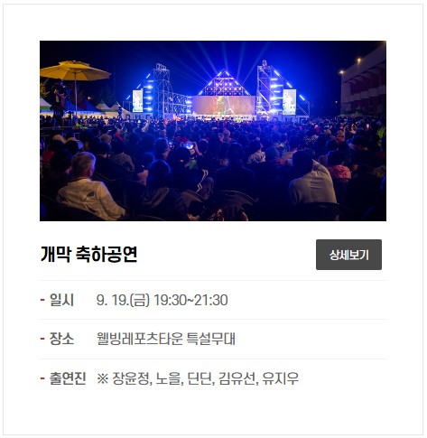 - 개막 축하 공연 (9.19): 장윤정, 노을, 딘딘, 김유선, 유지우
