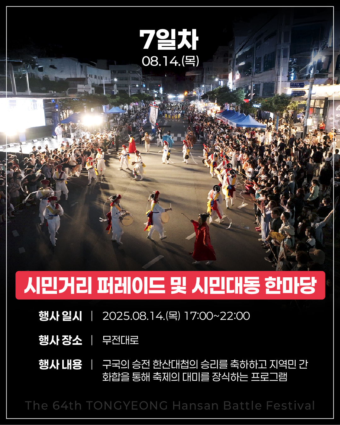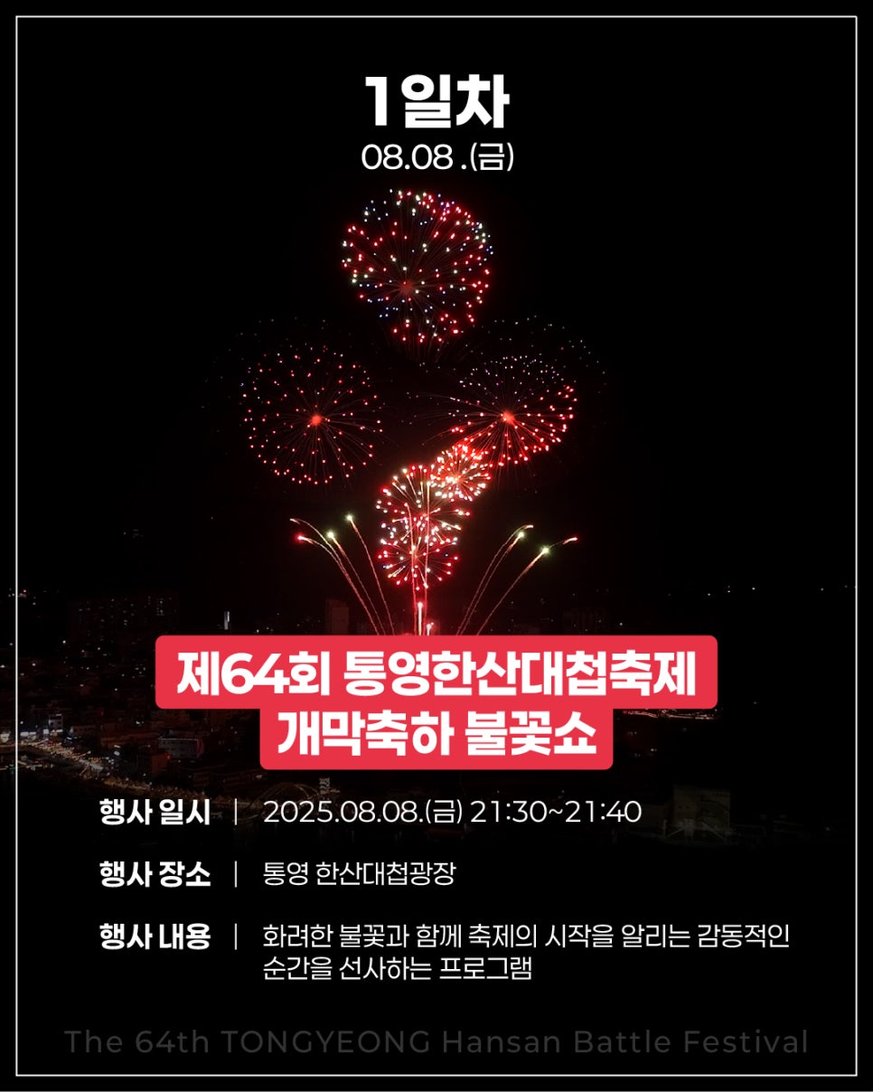 제64회 통영한산대첩축제 일정은 2025년 8월 8일(금)부터 14일(목)까지 7일간 이어집니다.