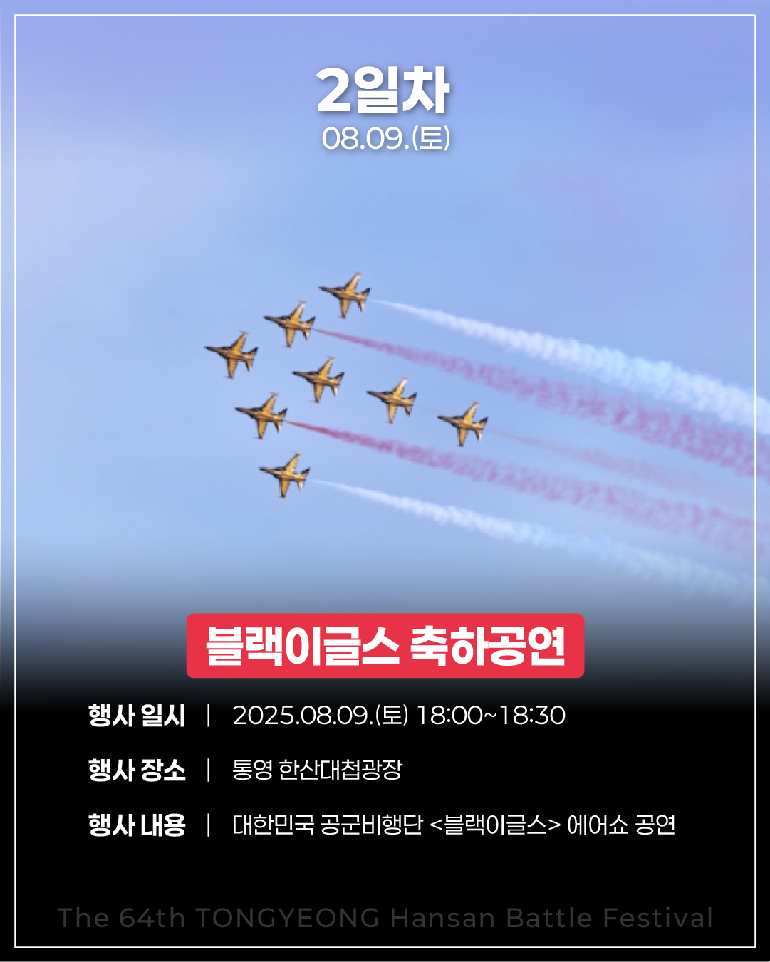 - 8월 9일(토): 블랙이글스 에어쇼, 트롯공연, 불꽃놀이, 지역예술 공연