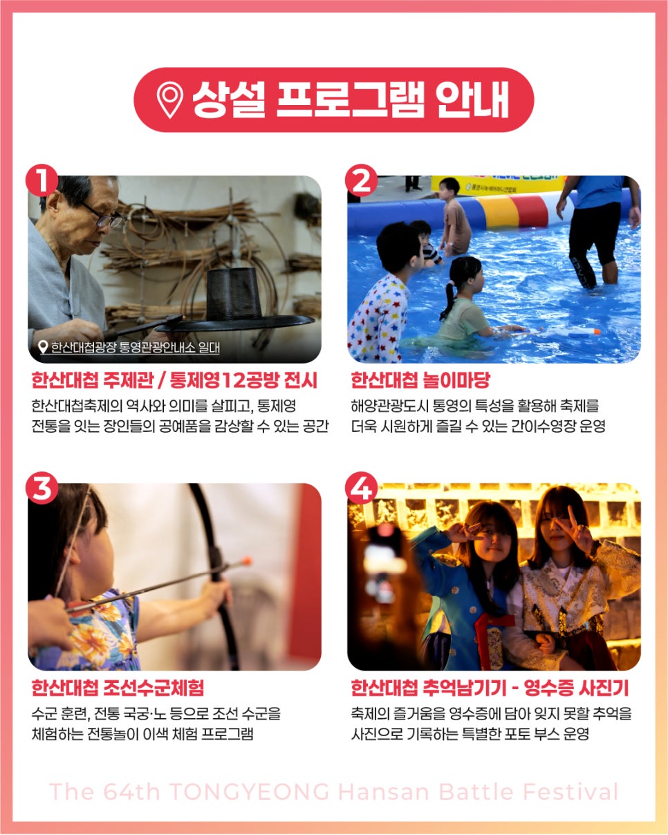 - 지역 먹거리: 통영 중앙시장, 축제장 내 푸드트럭, 한산대첩 주전부리존