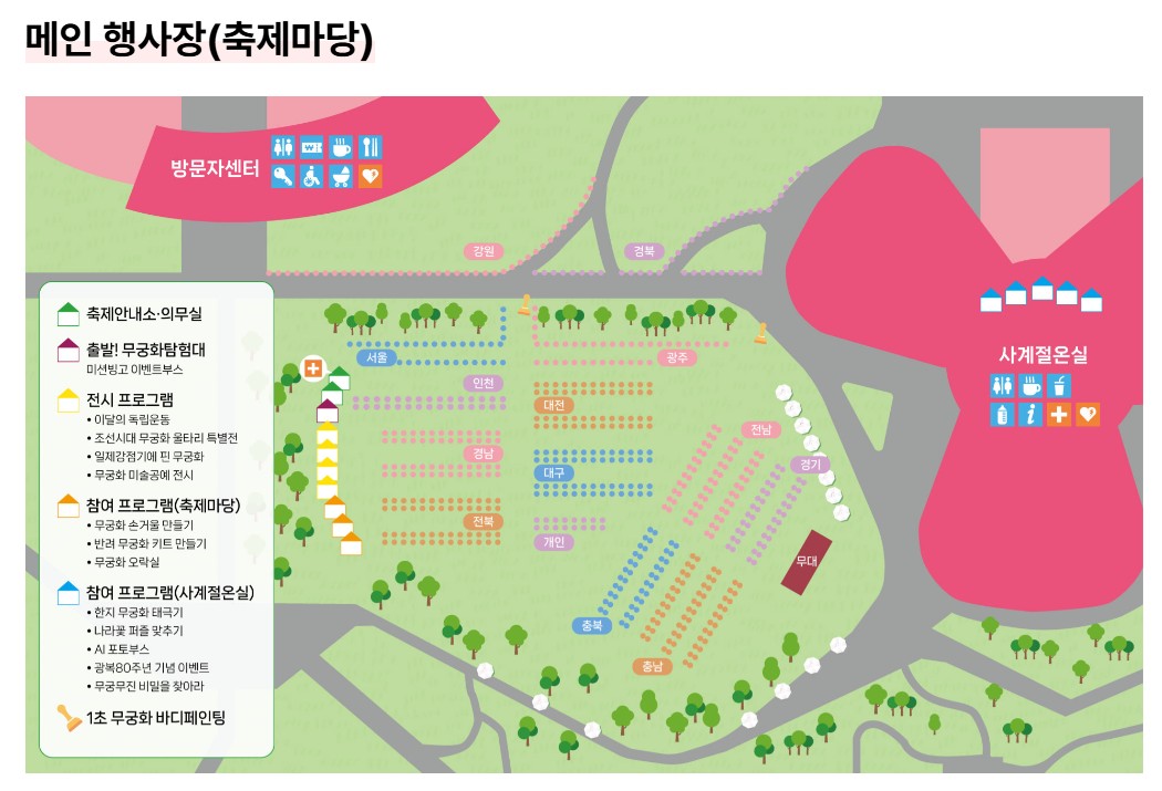 - 포토존: 열기구 모형, 캐릭터, 무궁화 프레임 등 촬영 포인트 운영