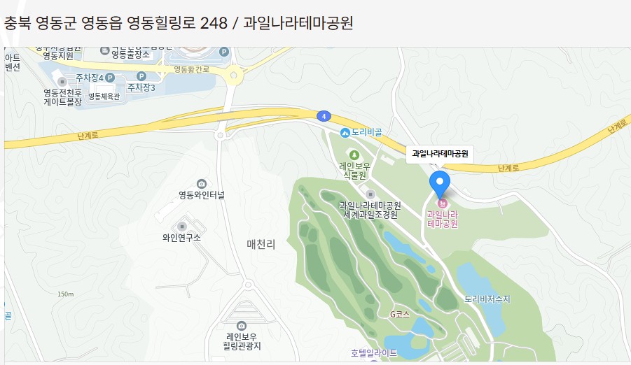 - 자가용: 중부고속도로 영동IC 진출 후 과일나라테마공원까지 약 10분 소요